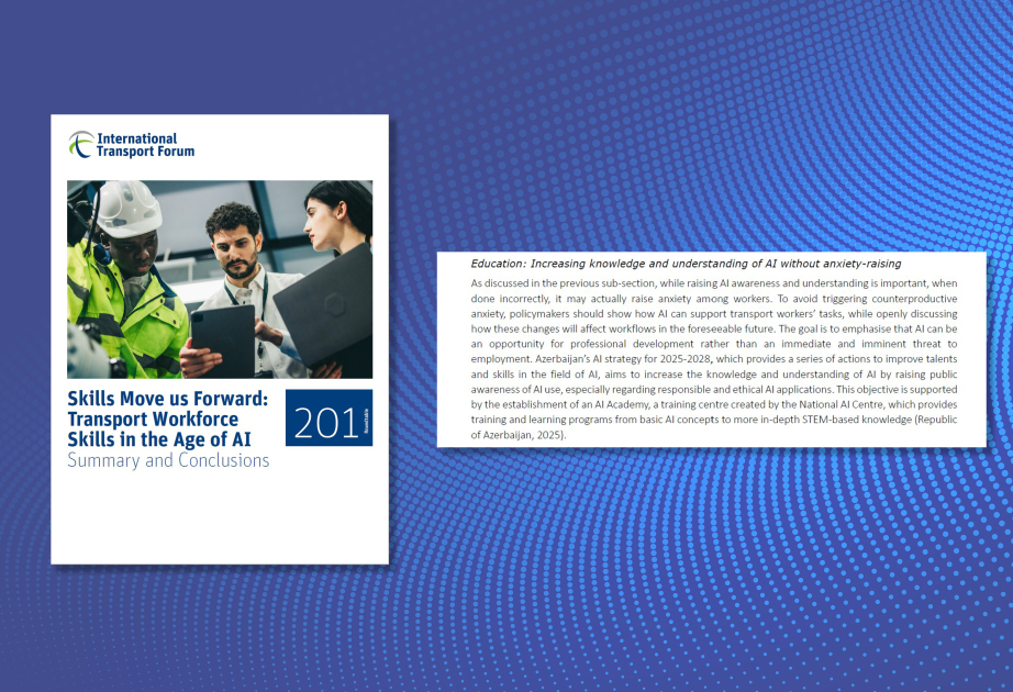 Fortunamag.az “AZƏRTAC”a istinadən xəbər verir ki, Beynəlxalq Nəqliyyat Forumunun (BNF) dərc etdiyi “Bacarıqlar bizi irəli aparır: süni intellekt dövründə nəqliyyat sahəsində işçi qüvvəsinin bacarıqları – xülasə və nəticələr” adlı hesabatda ölkəmizin təcrübəsinə xüsusi yer ayrılıb.