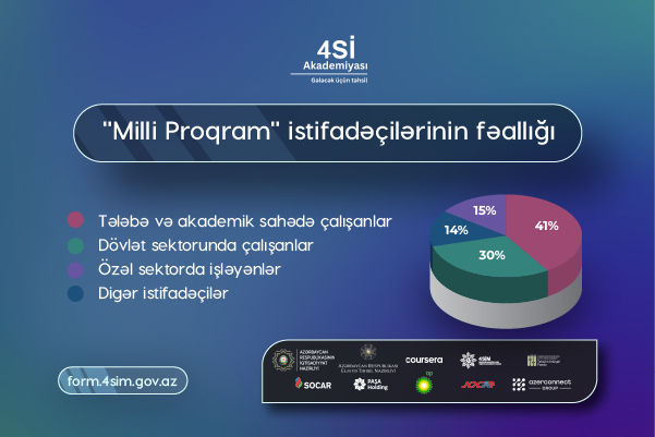 “4Sİ Akademiyası” çərçivəsində “Milli Proqram”da indiyədək 37500 nəfər “Coursera” platformasındakı təlimlərdən yararlanıb. İstifadəçilər 193 mindən çox təlimə müraciət edib və 69 min təlimi uğurla başa vurublar.