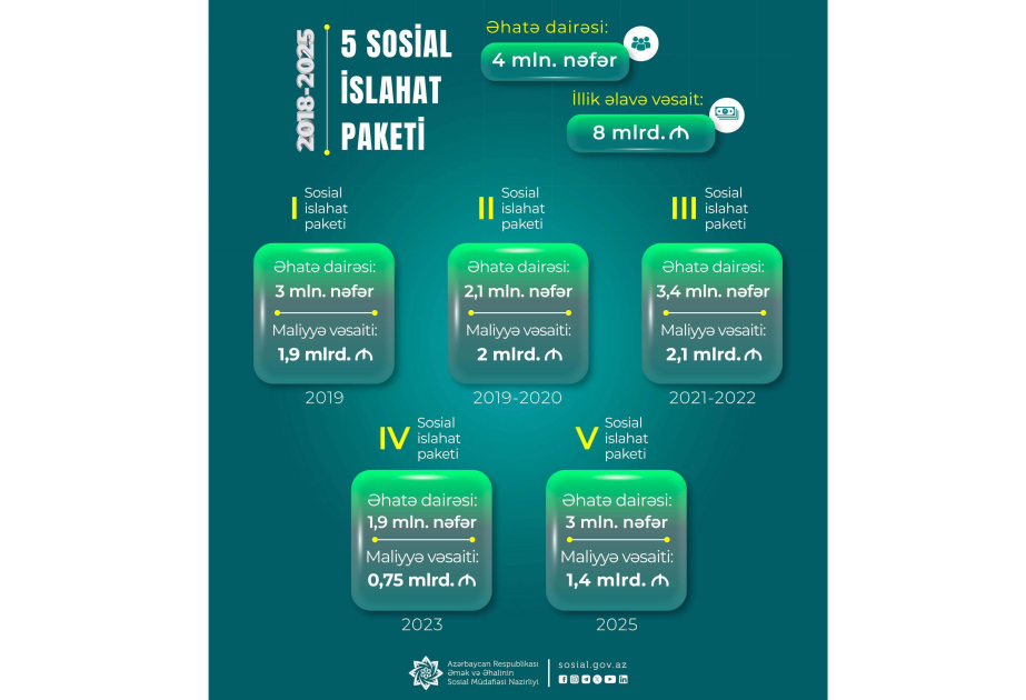 Əmək və Əhalinin Sosial Müdafiəsi Nazirliyinin İctimaiyyətlə əlaqələr şöbəsindən Fortunamag.az-a verilən məlumata görə, həmin sosial islahat paketləri əməkhaqqı, pensiya və digər sosial ödənişlərdə ciddi artımlara, o cümlədən minimum əməkhaqqında 3,1 dəfə, orta aylıq əməkhaqqında 2 dəfə, minimum pensiyada 3 dəfəyə yaxın, orta aylıq pensiyada 2,6 dəfə, sosial müavinət, təqaüd ödənişləri üçün ayrılan illik vəsaitdə 5 dəfə, ünvanlı yardımın hər ailəyə düşən orta aylıq məbləğində 2,4 dəfə artıma və s. imkan verib.