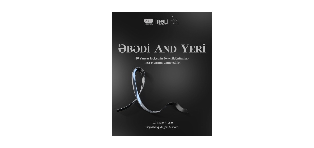 Fortunamag.az Azərbaycan Respublikasının Gənclər və İdman Nazirliyinə istinadən xəbər verir ki, “İRƏLİ” İctimai Birliyi və Beynəlxalq Muğam Mərkəzinin birgə təşkilatçılığı, Gənclər və İdman Nazirliyinin tərəfdaşlığı ilə 20 Yanvar faciəsinin 36-cı ildönümünə həsr olunmuş “Əbədi and yeri” adlı tədbir baş tutacaq.